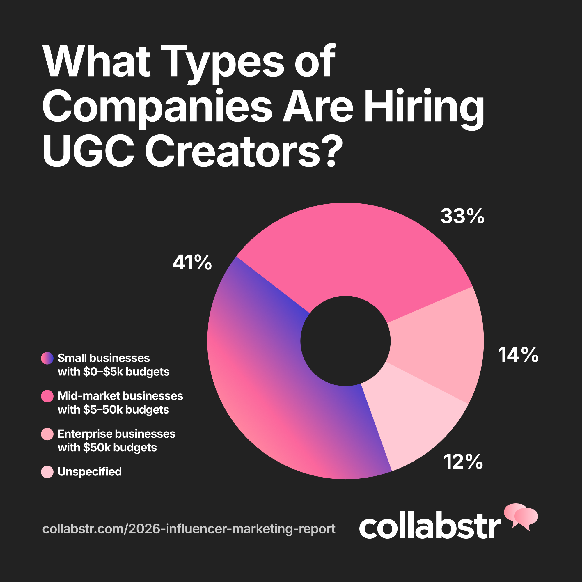 UGC is being driven primarily by smaller brands with smaller budgets. Over 40% of UGC campaigns come from companies spending less than $5k.