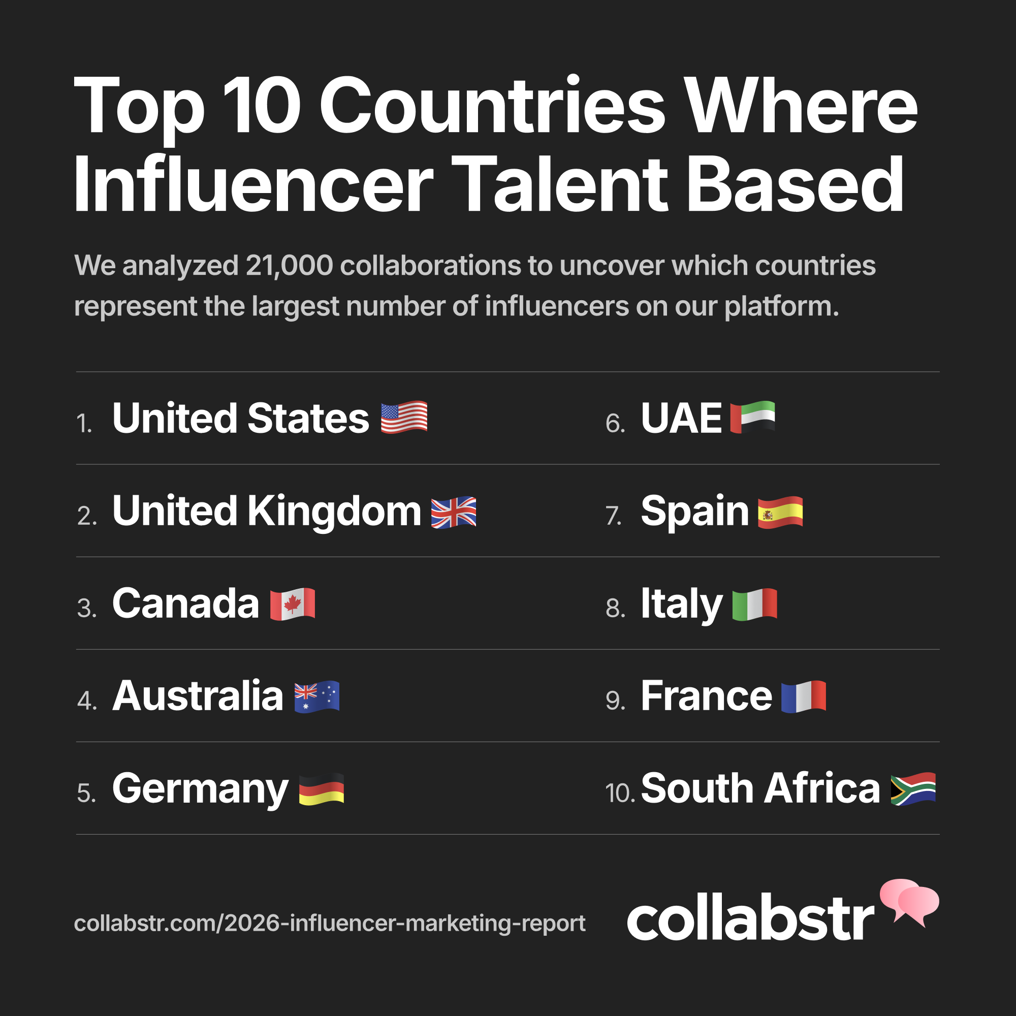 This spread shows that influencer talent remains heavily concentrated in Western, English-speaking markets. With the United States driving 66% of all collaborations, the center of gravity for creator work is still tied to regions with large consumer economies, strong digital advertising spend, and deeply established creator ecosystems.